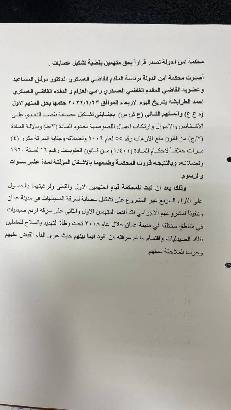 وجاء ذلك بعد أن ثبت للمحكمة قيام المتهمين الأول والثاني ولرغبتهما بالحصول على الثراء السريع غير المشروع على تشكيل عصابة لسرقة الصيدليات في مدينة عمان وتنفيذا لمشروعهم الاجرامي فقد أقدما المتهمين الاول والثاني على سرقة اربع صيدليات في مناطق مختلفة في مدينة عمان خلال عام 2018 تحت وطأة التهديد بالسلاح للعاملين بتلك الصيدليات واقتسام ما تم سرقته من نقود فيما بينهم حيث جرى القاء القبض عليهم وجرت الملاحقة بحقهم.