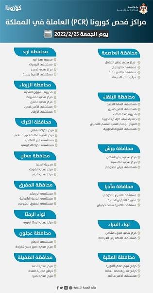 : أعلنت وزارة الصحة أسماء مراكز فحص كورونا (PCR) العاملة يوم غد الجمعة 2022/2/25 في المملكة مع الإشارة إلى أن دوام مراكز الفحص يبدأ من الساعة 9:00 صباحاً - 2:00 مساء.