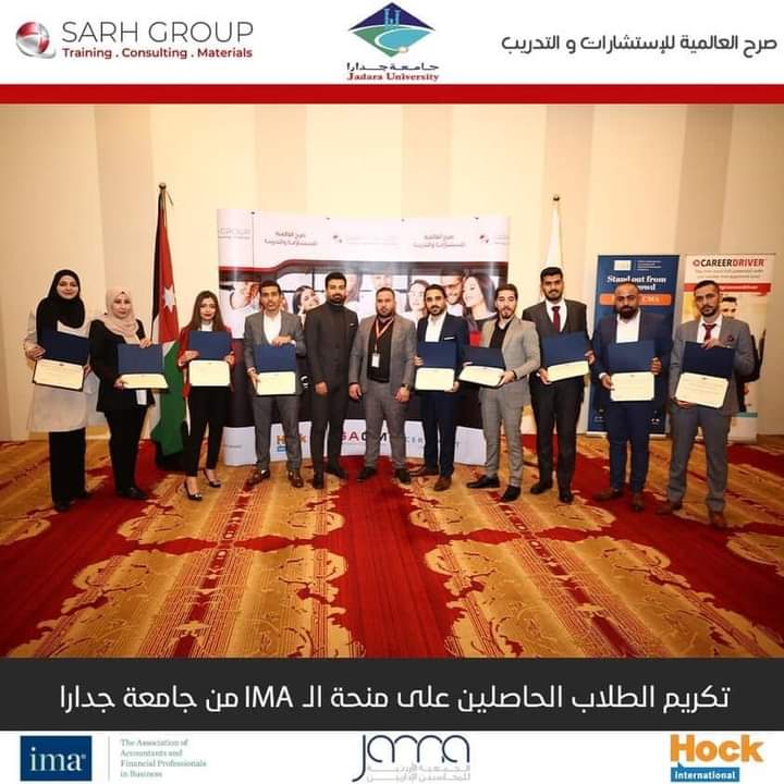 حصل عدد من طلبة قسم المحاسبة في جامعة جدارا على منحه شهاده المحاسب الإداري المعتمد الدولیة (CMA)، المقدمه من معهد المحاسبين الإداريين الأمريكي (IMA) والذي نظمته مؤسسة الجمان لإستشارات الأعمال الإدارية – مركز تدريب صرح – وتم تقديم منح CMA للطلبة المتميزين من قسم المحاسبة في الجامعة والذين رافقهم الدكتور مناف العقيلي ممثلاً عن قسم المحاسبة في الإحتفال الكبير الذي دعت إلية مؤسسة الجمان في فندق لاند مارك بمشاركة كبيرة من الجامعات الأردنية وبحضور مندوبي IMA ومندوبي JAMA والطلبة الحاصلين على المنحة هم خالد الشناينة، ومحمد محاميد، عادل العظمة، وعبد الرحمن الحايك، وأمل جبور، ويزن الشريف، وعائشة شنيك، وسهى العايش، وحسام الباد.