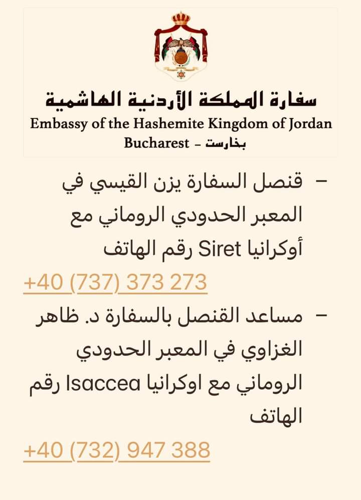 تنفيذا لقرارت الاجتماع الموسع لخلية الأزمة في وزارة الخارجية وشؤون المغتربين المعنية بمتابعة أوضاع الأردنيين في أوكرانيا، تم ايفاد قنصل السفارة يزن القيسي الى المعبر الحدودي Siret ومساعد القنصل د. ظاهر الغزاوي الى معبر Isaccea لتقديم كافة أشكال الإسناد والدعم الممكنة للمواطنين الأردنيين القادمين من اوكرانيا الى رومانيا،،