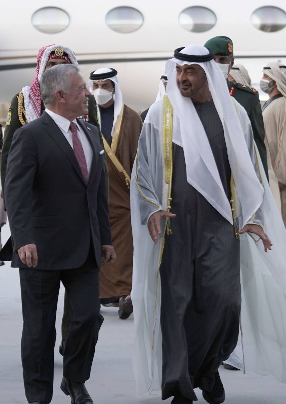 وكان في مقدمة مستقبلي جلالتيهما لدى وصولهما إلى مطار الرئاسة، سمو الشيخ محمد بن زايد آل نهيان ولي عهد أبوظبي، نائب القائد الأعلى للقوات المسلحة في دولة الإمارات العربية المتحدة.