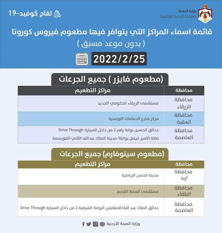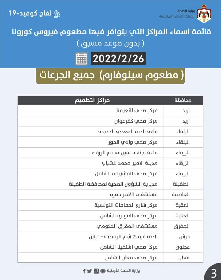 وفي منشور لها عبر "فيسبوك"، قالت إن المطاعيم المتوفرة هي "فايزر" و"سينوفارم"، منوهة بأن دوام مراكز المطاعيم من الساعة 8:00 صباحًا – 3:00 مساءً.