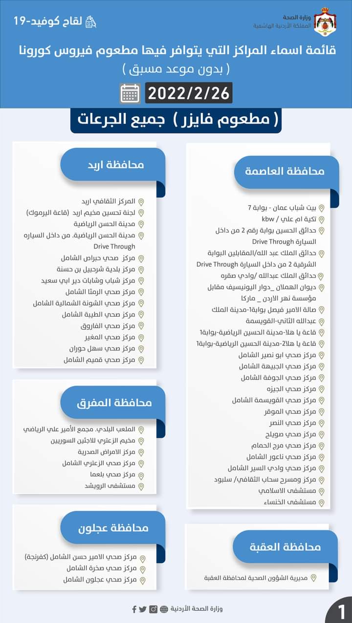 أعلنت وزارة الصحة عن قائمة أسماء المراكز التي يتوافر فيها مطعوم فيروس كورونا (بدون موعد مسبق) وبجميع الجرعات ليوم غد السبت .