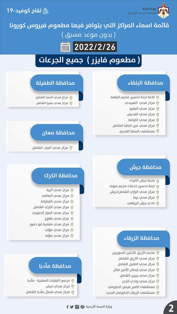 قائمة اسماء المراكز التي يتوافر فيها مطعوم فيروس كورونا (بدون موعد مسبق) #جميع_الجرعات ليوم السبت الموافق 2022/2/26 :