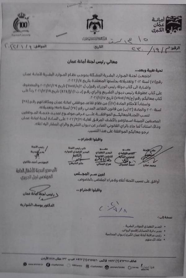 : وافق رئيس لجنة أمانة عمان الكبرى يوسف الشواربة، على تنسيب لجنة الموارد البشرية في الامانة بتمديد خدمة 15 موظفا أتموا السن القانونية 60 عاما، لغاية 31-3-2022.