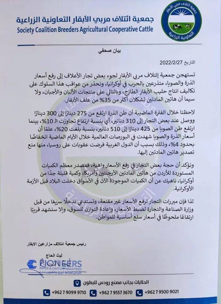 استهجنت جمعية ائتلاف مربي الأبقار لجوء بعض تجار الأعلاف إلى رفع أسعار الذرة والصويا، متذرعين بالحرب في أوكرانيا.