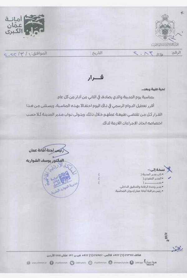 نيروز الإخبارية : قرر رئيس لجنة امانة عمان الكبرى الدكتور يوسف الشواربة تعطيل الدوام الرسمي ليوم الأربعاء بمناسبة يوم المدينة الذي يصادف 2 من اذا كل عام.