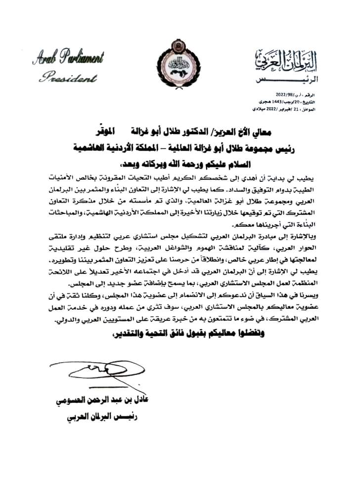 قرر البرلمان العربي انتخاب سعادة الدكتور طلال أبوغزاله رئيس ومؤسس "طلال أبوغزاله العالمية"، عضواً في المجلس الاستشاري العربي، الذي يضم ثمان شخصيات، يتم ترشيح سبعة منهم من قبل الحكومات العربية الأعضاء في البرلمان، أما الثامن فيتم ترشيحه من المجلس، ليكون الدكتور أبوغزاله.