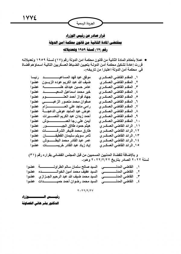 إعادة تشكيل محكمة أمن الدولة برئاسة المقدم القاضي المساعيد