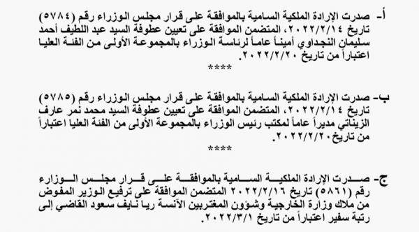 : صدر في عدد الجريدة الرسمية اليوم الثلاثاء الارادات الملكية السامية بالموافقة على تعيين عبداللطيف النجداوي أمينا عاما لرئاسة الوزراء، ومحمد الزيناتي مديرا عاما لمكتب رئيس الوزراء، وترفيع الوزير المفوض ريا نايف القاضي إلى رتبة سفير..