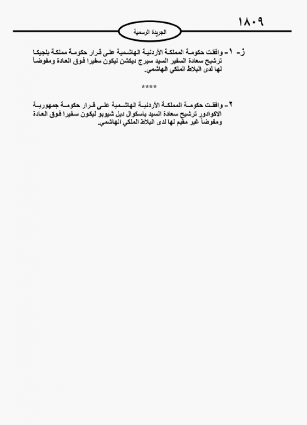 ووافقت الحكومة على قرار حكومة مملكة بلجيكا ترشيح السفير هاري فيرفاي، ليكون سفيرا فوق العادة ومفوضا لها لدى البلاط الملكي الهاشمي، وعلى قرار حكومة الاكوادور بترشيح باسكوال شيبوبو ليكون سفيرا فوق العادة ومفوضا لها لدى البلاط الهاشمي.