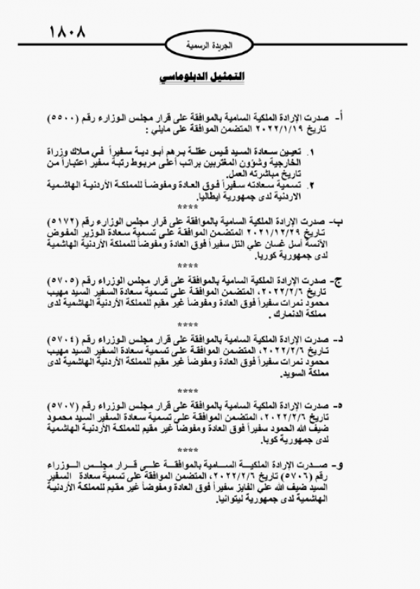 كما صدرت الإرادة الملكية بالموافقة على تسمية السفير مهيب محمود النمرات سفيرا فوق العادة ومفوضا غير مقيم للأردن لدى السويد.