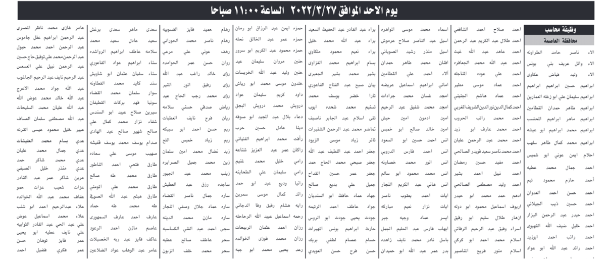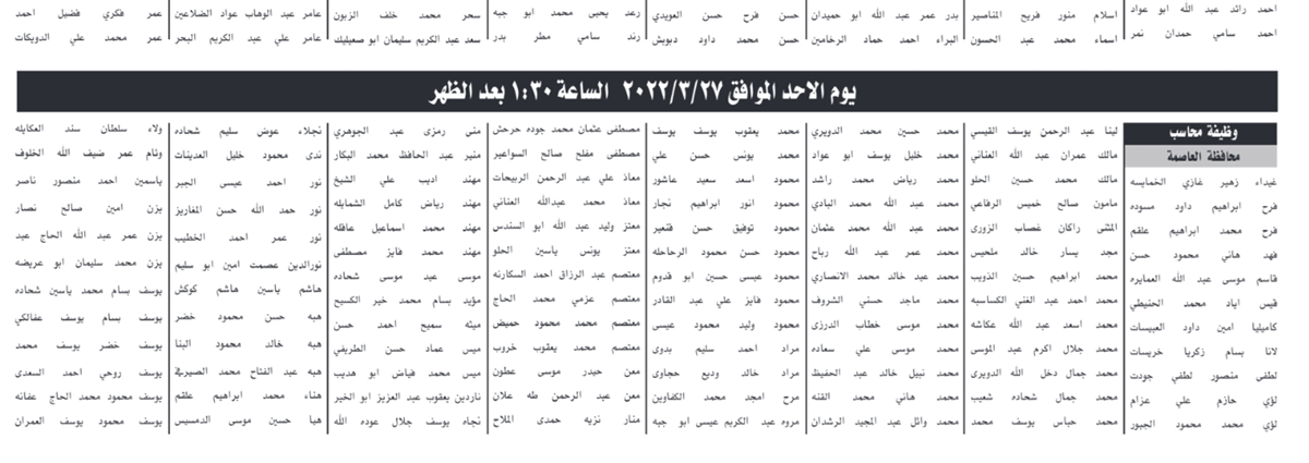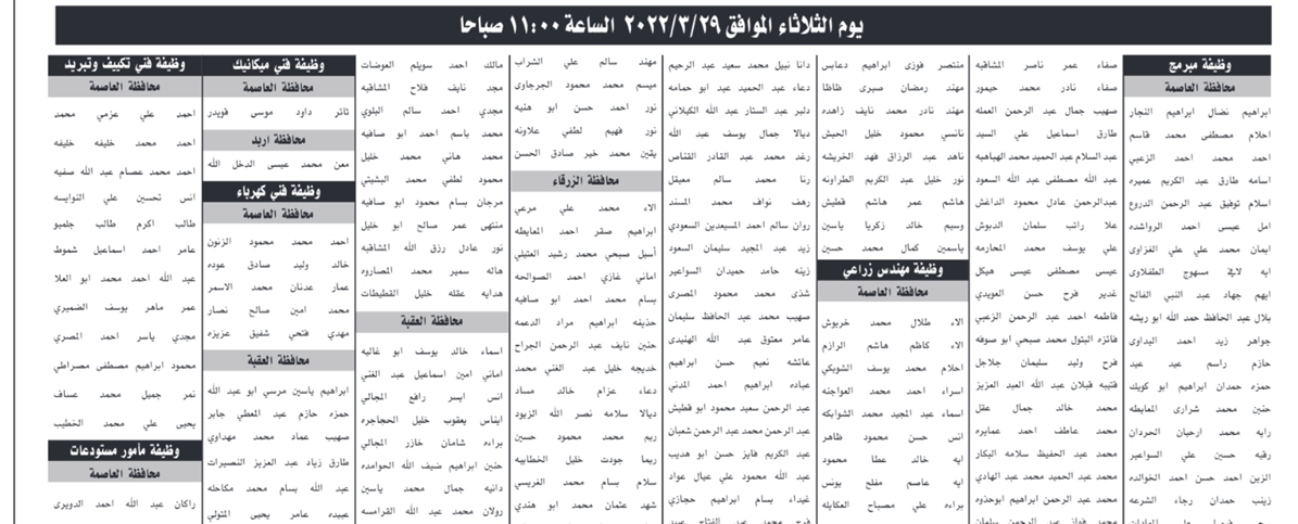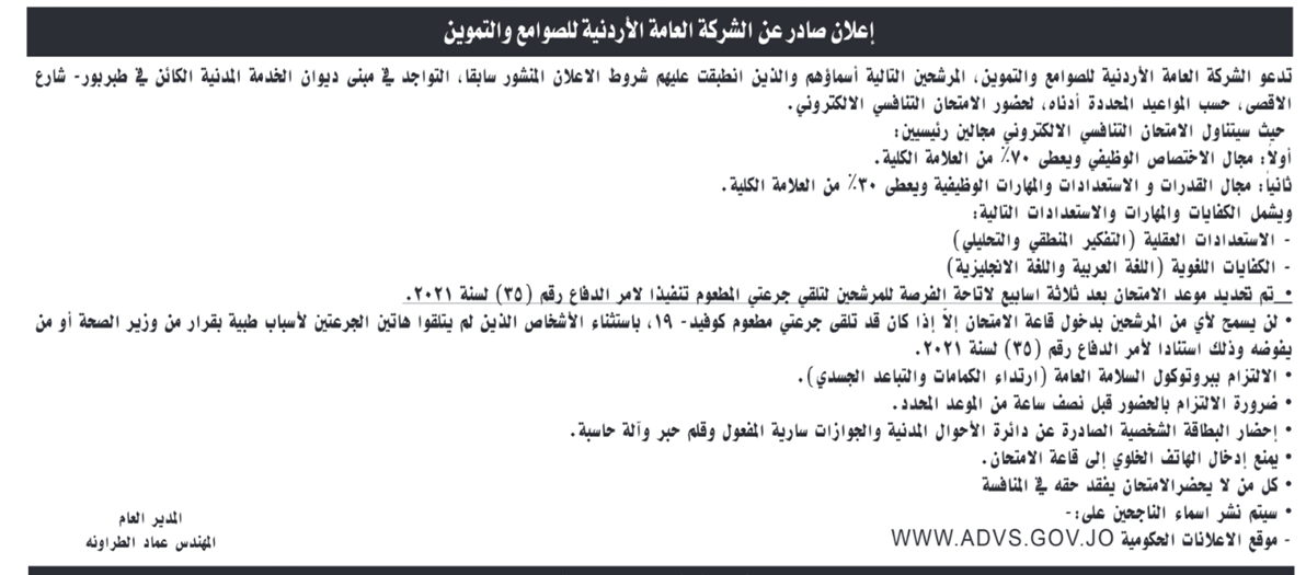 : دعت الشركة العامة الأردنية للصوامع والتموين الأسماء التالية والذين انطبقت عليهم الشروط التواجد في مبنى الشركة لتقديم الامتحان التنافسي بحسب المواعيد المحددة .