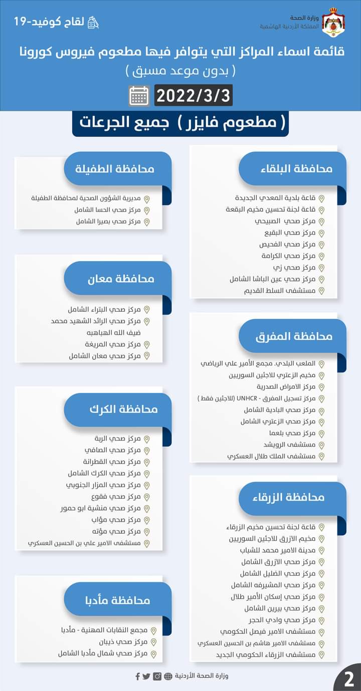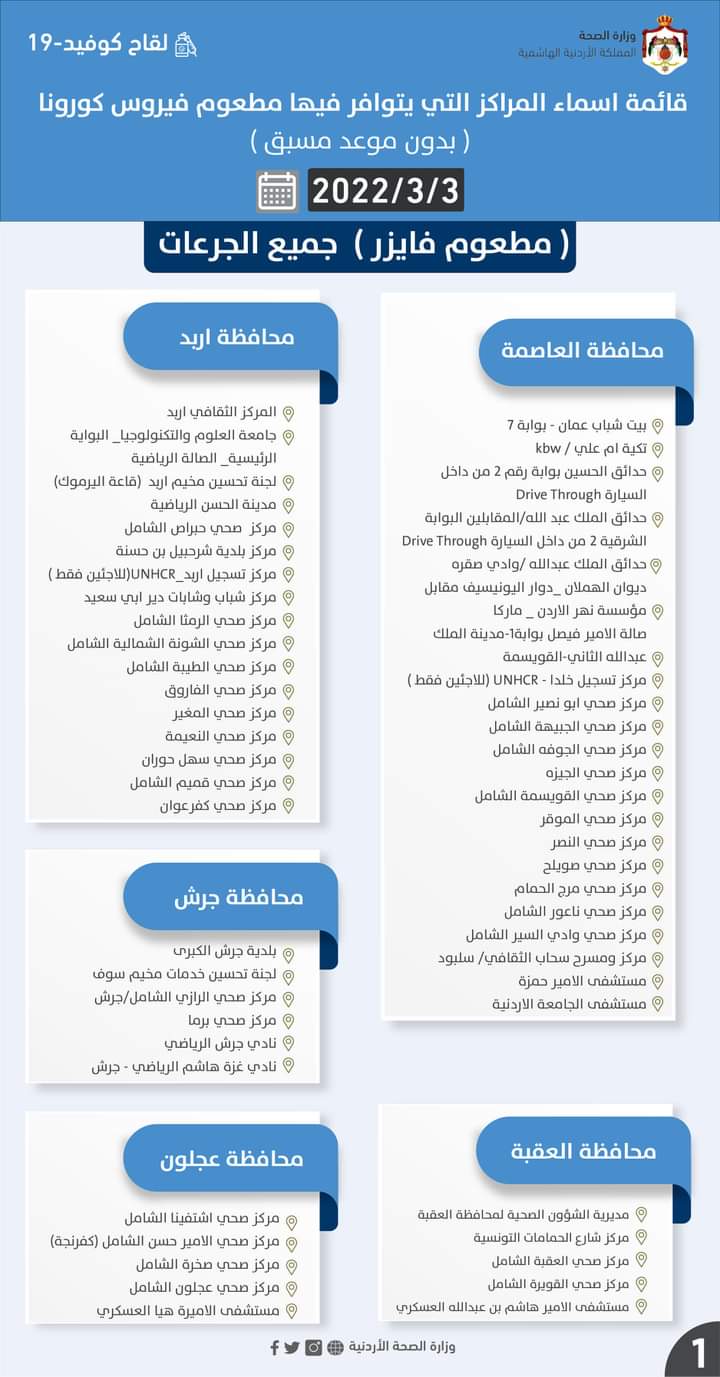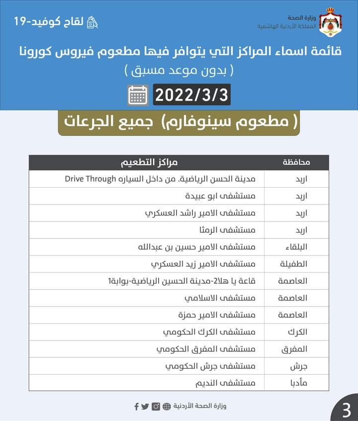 قائمة اسماء المراكز التي يتوافر فيها مطعوم فيروس كورونا (بدون موعد مسبق) #جميع_الجرعات ليوم الخميس الموافق 2022/3/3: