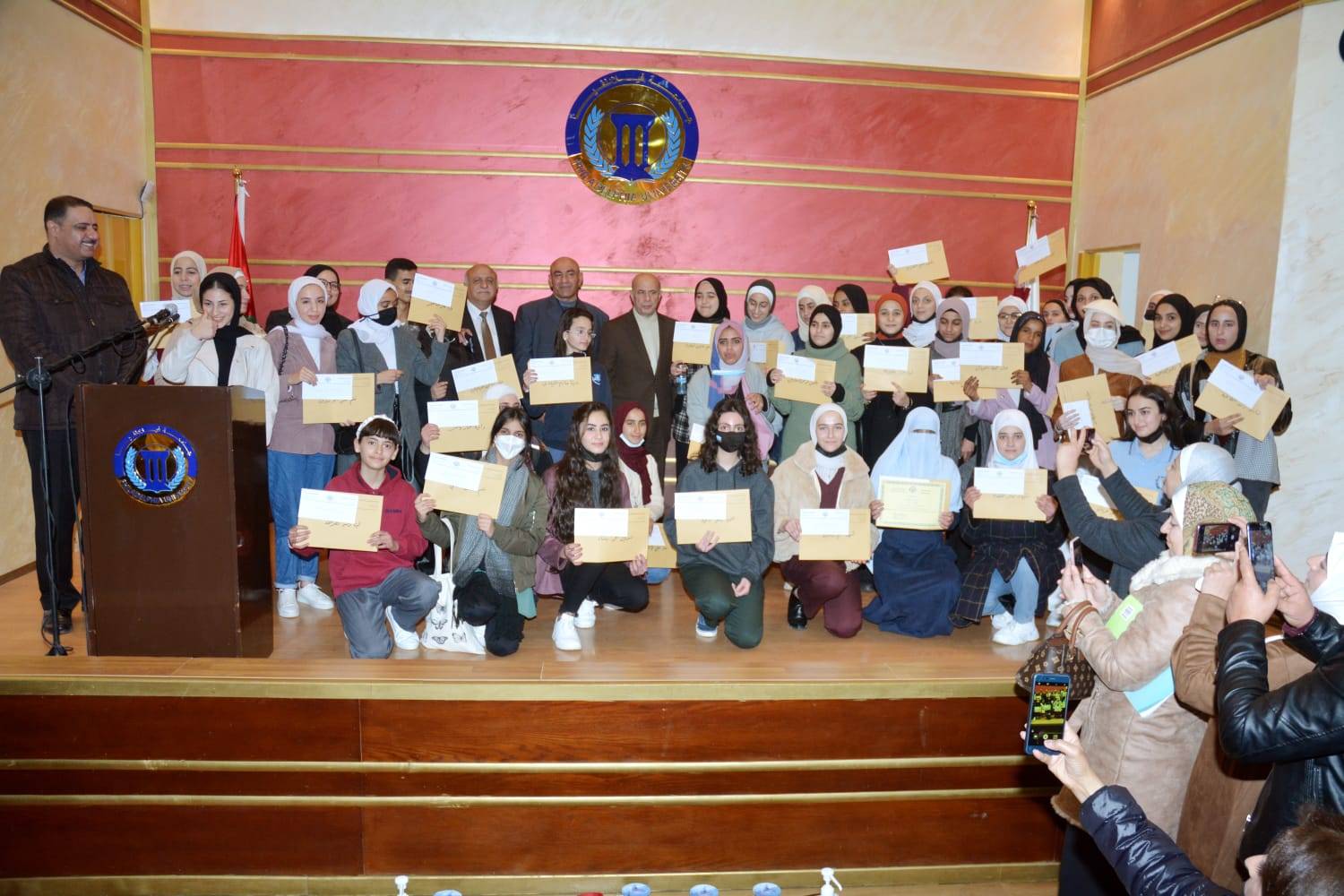 وفي نهاية الحفل قام رئيس الجامعة بتوزيع الشهادات والجوائز التقديرية والتذكارية على الطلبة الفائزين بحضور مندوب عن مدير تربية جرش وعدد من العمداء وأعضاء الهيئة التدريسية والإدارية وأهالي الطلبة إضافة الى معلميهم .