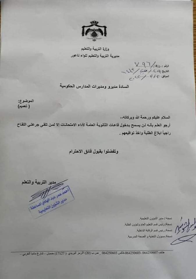 عممت وزارة التربية والتعليم على جميع مديرياتها بمنع دخول طلبة التوجيهي لقاعات الامتحانات الا لمن تلقى جرعتي اللقاح.