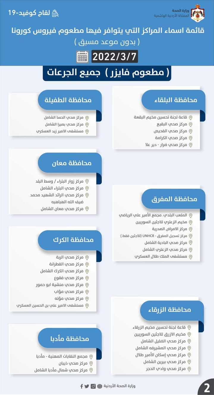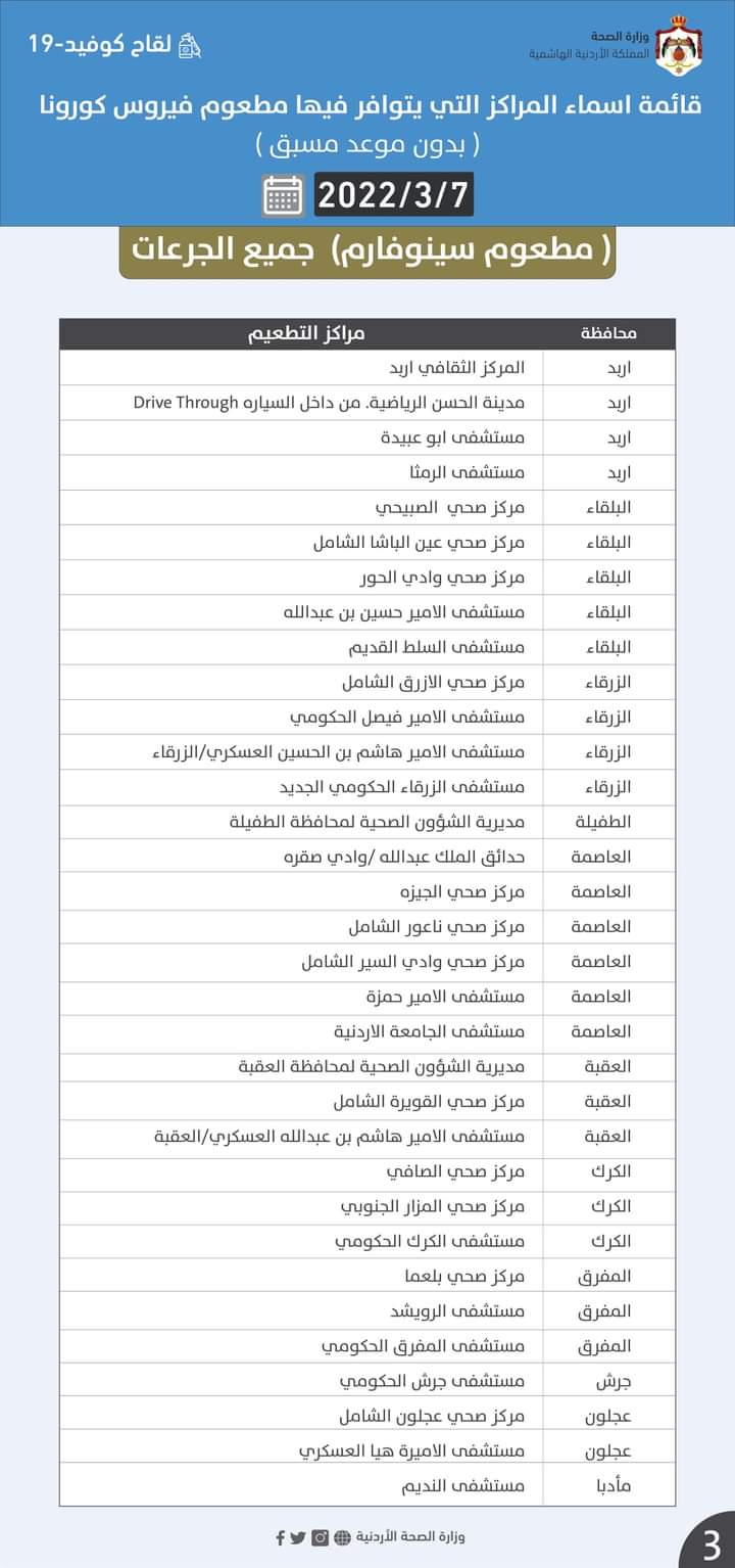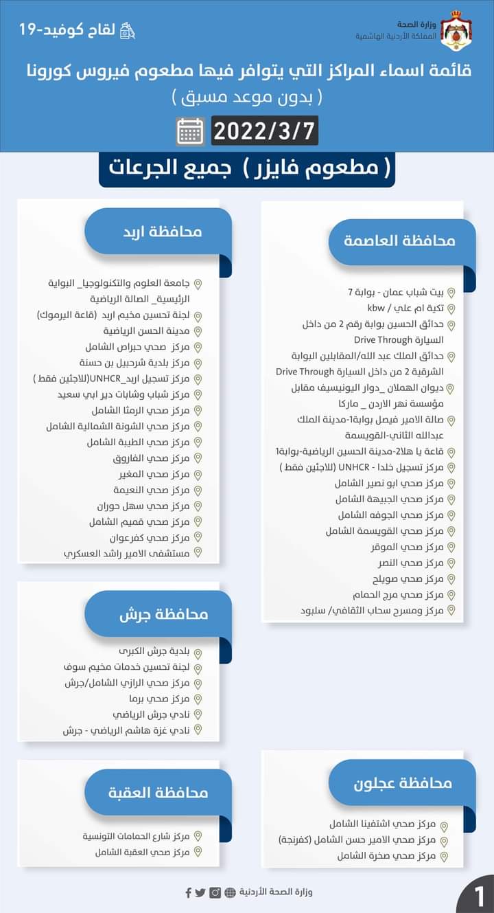 قائمة اسماء المراكز التي يتوافر فيها مطعوم فيروس كورونا (بدون موعد مسبق) #جميع_الجرعات ليوم الإثنين الموافق 2022/3/7: