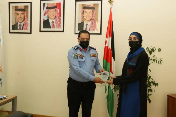 ويأتي هذا اللقاء ضمن توجهات الجامعة وتنفيذاً لرؤيتها ورسالتها وأهدافها لترسيخ العلاقات مع مؤسسات المجتمع المدني والعسكري وذلك لرفع سوية المخرجات التعليمية ومخرجات البحث العلمي، وفي نهاية اللقاء قدمت الأستاذ الدكتورة إخلاص الطراونة درع الجامعة تكريماً للوفد.