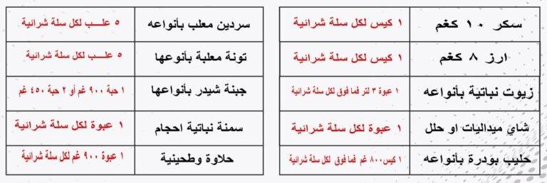 ولمواجهة مثل هذه الحالات، قررت المؤسسة تحديد الكميات المباعة لكل سلة شرائية من هذه الاصناف كي يستفيد منها المواطن فقط وليس لغايات المتاجرة، داعية المواطنين إلى التعاون التام والالتزام بشراء السلع التالية بالكميات المحددة دون زيادة لضمان توفرها بنفس الاسعار وعدم نفاذ المخزون والابلاغ عن اية حالات شراء غير عادية او تكرار الشراء من نفس الاشخاص.
