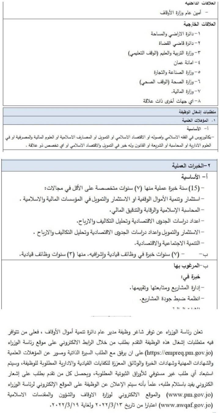 اعلنت رئاسة الوزراء ، السبت ، عن توفر شاغر وظيفة مدير عام دائرة تنمية أموال الأوقاف ، فعلى من تتوافر فيه متطلبات إشغال هذه الوظيفة التقدم بطلب من خلال الرابط الالكتروني على موقع رئاسة الوزراء (https://empreq.pm.gov.jo) .