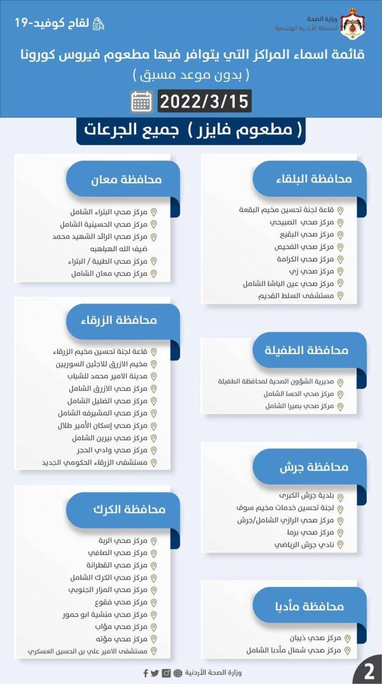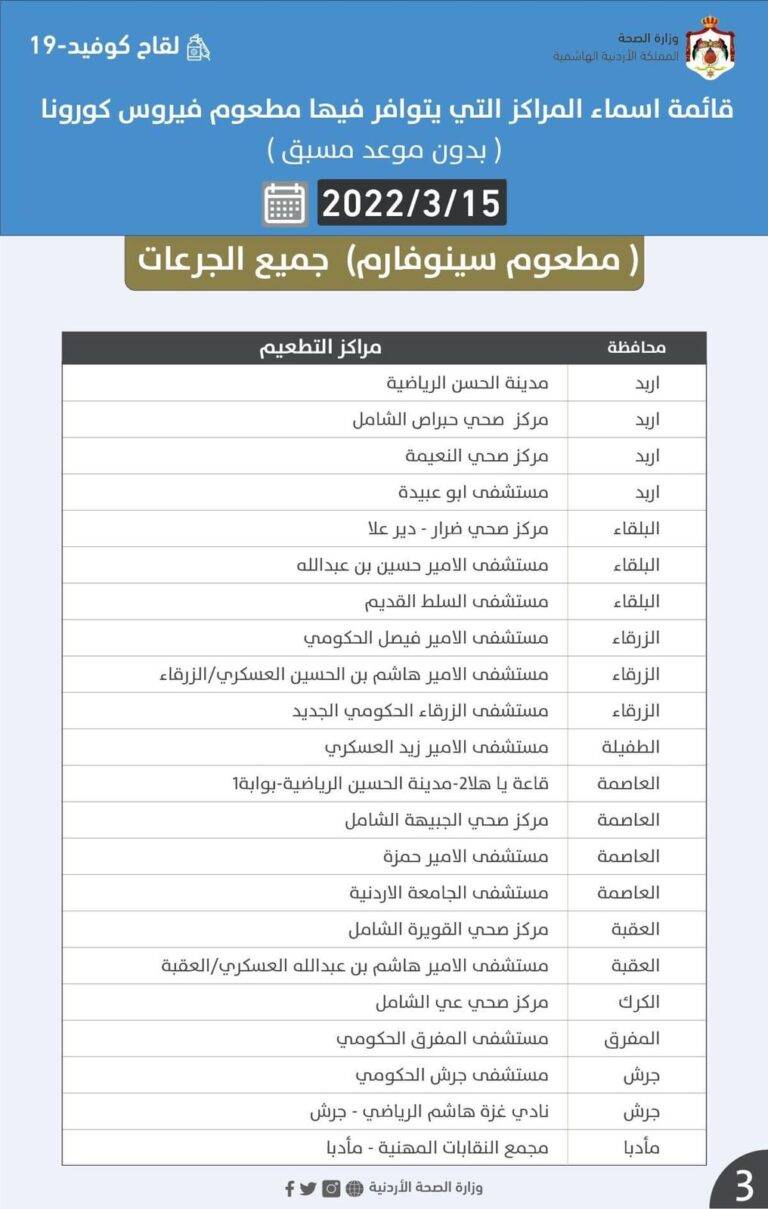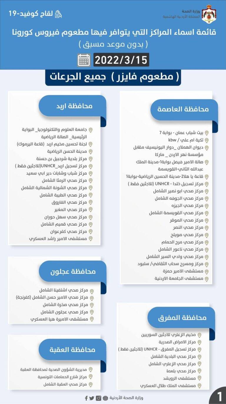 أعلنت وزارة الصحة قائمة أسماء المراكز التي يتوفر فيها مطعوم فيروس كورونا المستجد (دون موعد مسبق)، ولجميع الجرعات من صنفي "فايزر” و”سينوفارم” ليوم غد الثلاثاء الموافق 2022/3/15.