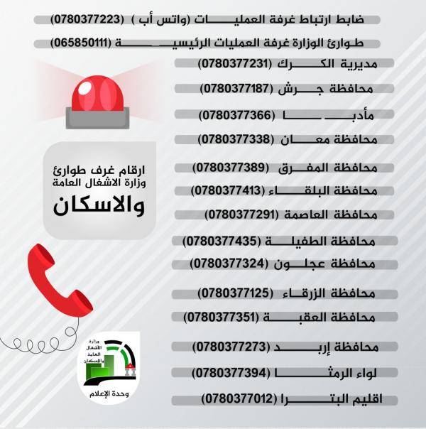 وفيما يتعلق باستقبال الملاحظات والشكاوى، بينت الوزارة أن يتم استقبلها من خلال تطبيق نظام بلاغات طوارئ وزارة الاشغال العامة والإسكان، حيث يتيح التطبيق إضافة البلاغات والشكاوى في مختلف مناطق المملكة من قبل المواطنين وارفاق الفيديوهات والصور بشكل اختياري لتحديد نوع البلاغ للتعامل معه، ويتم تحديد موقع الشكوى والتحرك فورا لحلها واجراء اللازم بالتنسيق مع الجهات ذات العلاقة في حال تطلب الامر ذلك، أو من ارقام غرف الطوارئ والتي تعمل على مدار 24 ساعة على الأرقام التالية: