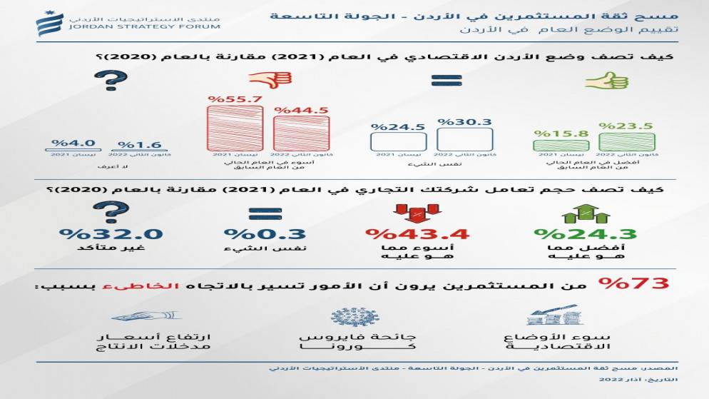 وبينت نتائج المسح أن نسبة المستثمرين الذين وسعوا أعمالهم في الأردن خلال العام الماضي لم تتجاوز 5%، في حين ارتفعت نسبة المستثمرين الذين قلصوا أعمالهم في الأردن من 41% في (نيسان/أبريل 2021) إلى 54% خلال (كانون الثاني/يناير 2022)، وهو ما يؤشر إلى حجم الجمود في الحركة التجارية خلال العام الماضي.