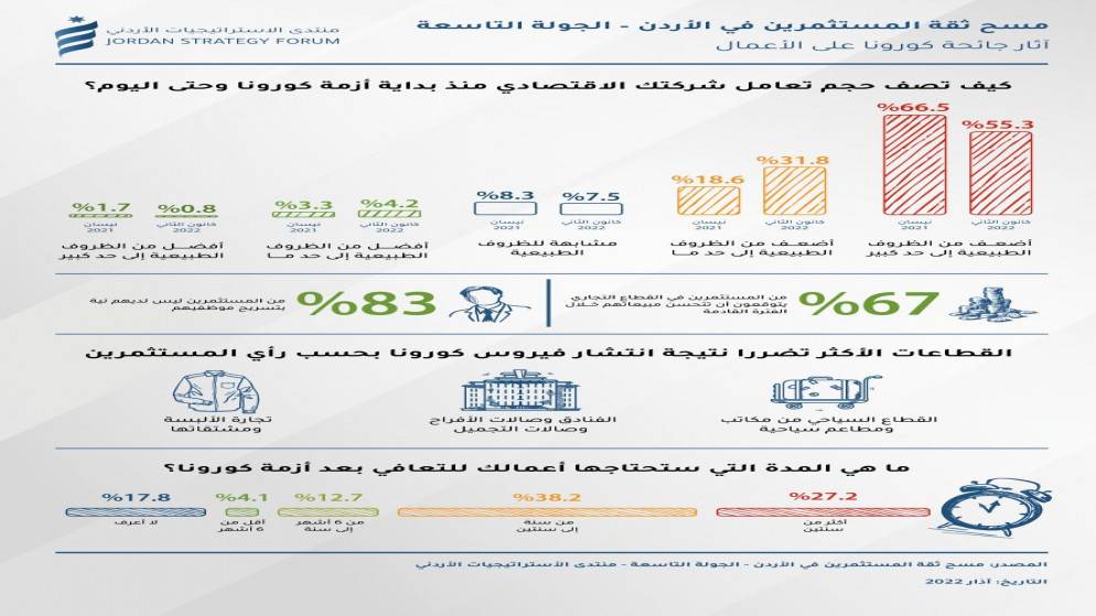 وحول أثر جائحة كورونا على الأعمال، وجه منتدى الاستراتيجيات الأردني سؤالا للمستثمرين في الأردن عن حجم تعامل شركاتهم الاقتصادي منذ بداية أزمة كورونا حتى بداية 2022، أشار أكثر من نصف المستثمرين 55% بأن حجم التعامل الاقتصادي كان أضعف من الظروف الطبيعية إلى حد كبير، في حين أشار نحو 32% من المستثمرين أن حجم التعامل الاقتصادي منذ بداية الأزمة أضعف من الظروف الطبيعية إلى حد ما.