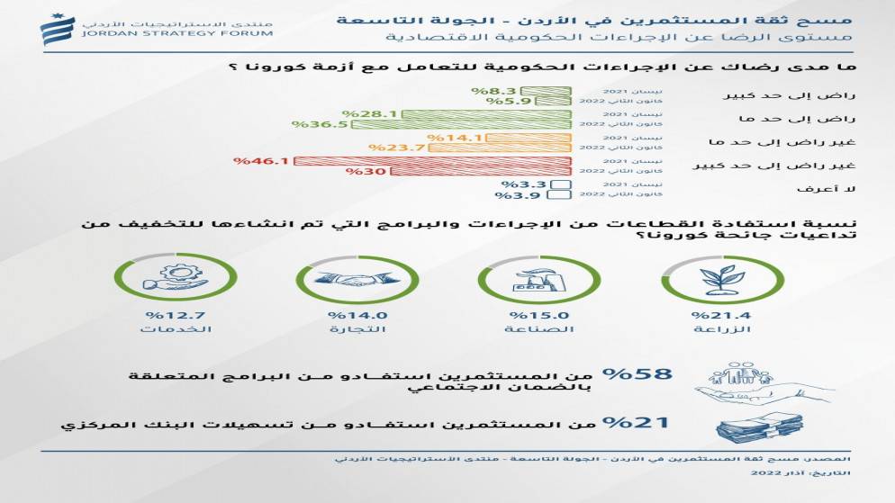 وشمل المسح 613 شركة من مختلف القطاعات، تتراوح أحجامها ما بين شركات كبيرة ومتوسطة وصغيرة الحجم، وأشارت النتائج إلى زيادة نسبة المستثمرين الذين يرون أن الوضع الاقتصادي في الأردن خلال 2021 كان أفضل من العام الذي سبقه.