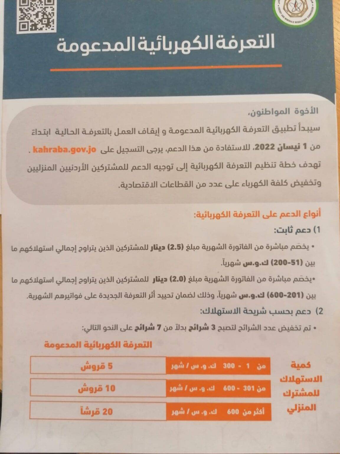وبينت الهيئة أنه وبعد الأول من نيسان سيتم إلغاء التعرفة المعمول بها حاليا ،ومن لم يسجل للحصول على الدعم ستطبق عليه التعرفة الجديدة غير المدعومة وليس التعرفة الحالية.