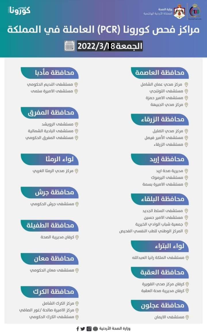 مراكز فحص كورونا (PCR) العاملة يوم الجمعة 2022/3/18 في المملكة حسب التالي: