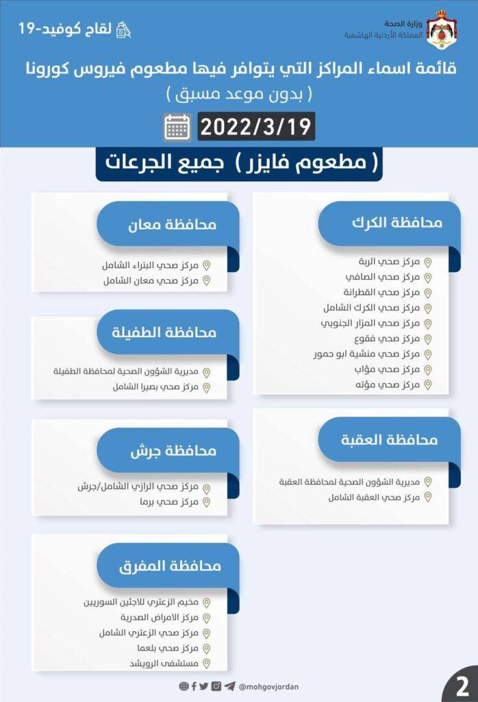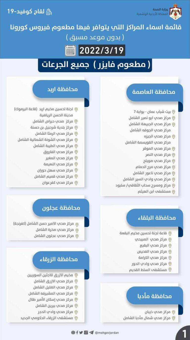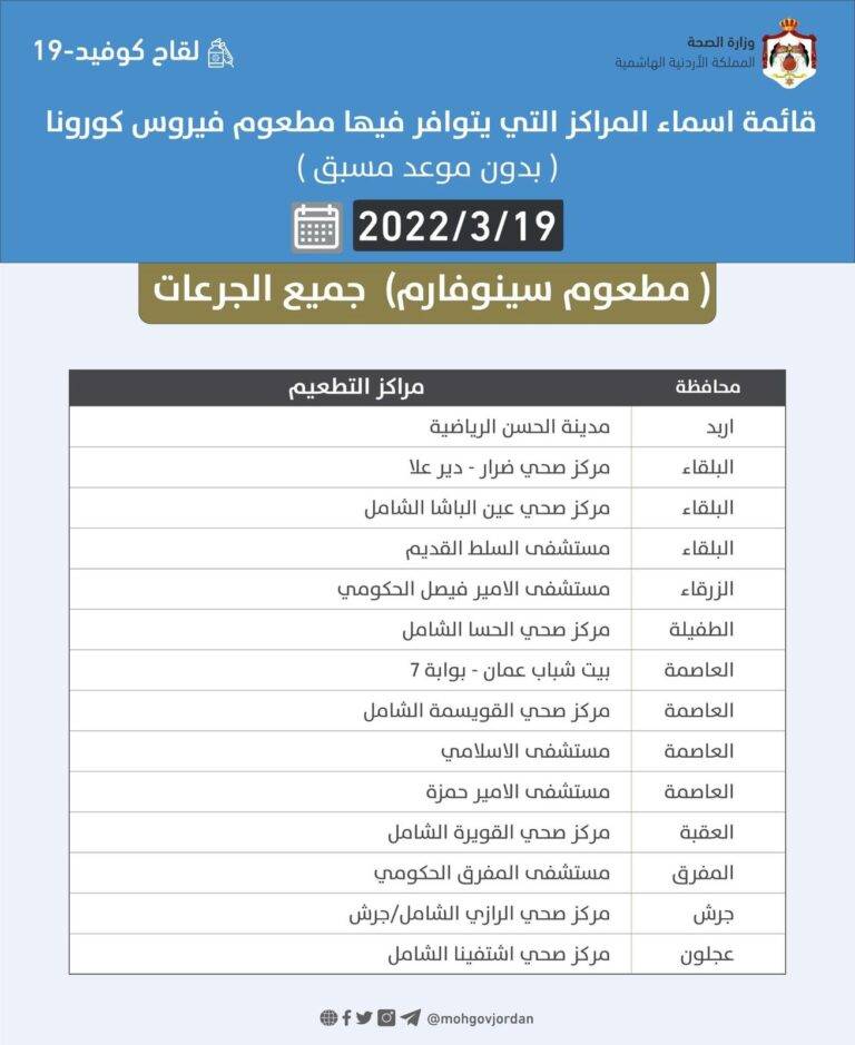 أعلنت وزارة الصحة قائمة أسماء المراكز التي يتوفر فيها مطعوم فيروس كورونا المستجد (دون موعد مسبق)، ولجميع الجرعات من صنفي "فايزر” و”سينوفارم”، ليوم غد السبت الموافق 2022/3/19.