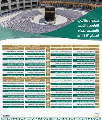 ويكشف الجدول عن أئمة صلاتي التراويح والتهجد في الحرم المكي بداية من أول الشهر الفضيل وحتى الليلة الـ 20 كما يوضح جدول الأئمة في العشر الأواخر من رمضان.