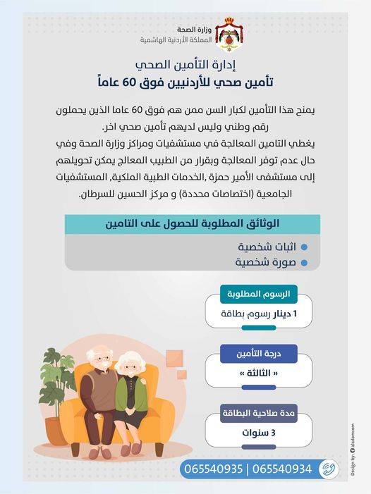 : دعت وزارة الصحة الأردنيين الذين تتجاوز أعمارهم 60 عاما إلى مراجعة إدارة التأمين الصحي المدني أو أقرب قسم تأمين صحي تابع لمديرية الشؤون الصحية في المحافظة التي يسكنون بها، مصطحبين معهم الوثائق المطلوبة للحصول على تأمين صحي.
