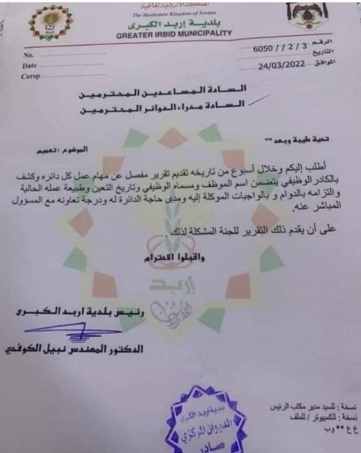 عمم رئيس بلدية اربد الكبرى على  المساعدين و مدراء الدوائر بتقديم تقريرًا مفصلًا عن مهام عمل كل دائرة خلال اسبوع  وذلك وفقًا للكتاب الذي اطلعت عليه نيروز .