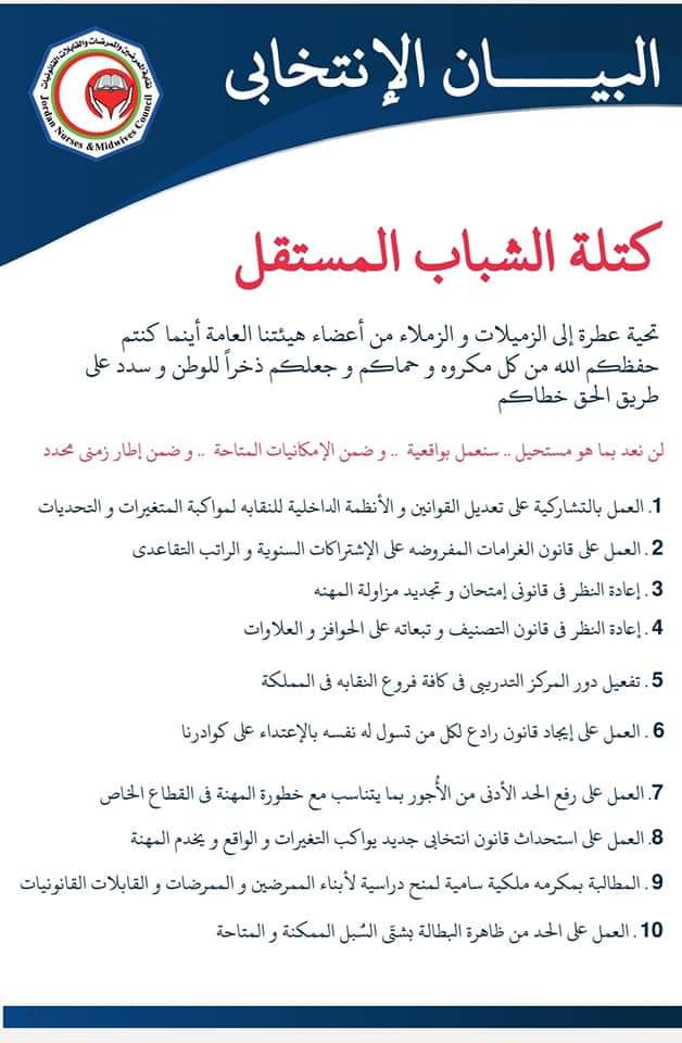 نعلن مشاركتنا في إنتخابات نقابة الممرضين و الممرضات و القابلات القانونيات لعام ٢٠٢٢ متوكلين على الله و على أمل أن نحضى بدعم هيئتنا العامة و أن نكون علامة فارقة في المجلس القادم لنصنع التغيير و نرتقي بمهنتنا و نكون خير من يدافع عن حقوقها بإيجابية و إيجاد حلول واقعية و منطقية  حسب الإمكانيات المتاحة و القابلة للتطبيق ضمن إطار زمني محدد