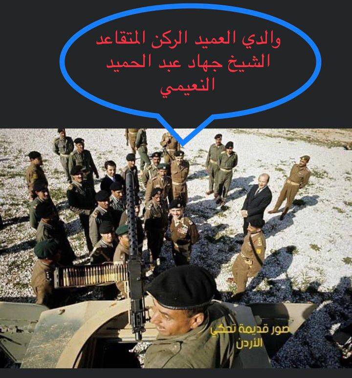 ساهم في تشكيل وجدانه الوطني والإنساني وإيمانه بالفكر القومي والده الشيخ المرحوم عبد الحميد ألنعيمي أحد ضباط الجيش ألفيصلي بسوريا وشارك بمعركة ميسلون المشهورة وبعد احتلال دمشق من قبل الفرنسيين ومغادره الملك فيصل سوريا حضر وأفراد عشيرته للأردن وكان من الذين استقبلوا جلاله الملك المؤسس عبد الله الأول بن الحسين في معان . انه العميد الركن المتقاعد ( المقدم الركن " ركن أول عمليات فرقه المشاة الأولى " المشاركة في معركة الكرامة عام 1968) * جهاد عبد الحميد ألنعيمي *الكرامة المضاءة بخضره البرتقال والليمون والبلح والشهداء والبطولة من الذين كتبوا خيط عزتها على فوتيكهم يؤمن أن الجندية لا تهاون ولا تواكل ولا تراخ . جهاد عبد الحميد ألنعيمي نبراس لأبناء هذا الوطن بين السطور حكاية يرويها عن معركة الكرامة.يقول على الباغي تدور الدائرة فالعدو ما فتئ يجوس الأرض ليعبث بالخريطة وان اجتياز الحدود التي رسمها العدو ضرب من المستحيل ,هنا لا مكان لأهانتنا وان من أرادوا أن يرتشفون القهوة على سفوح هذي الجبال محض خيال وأوهام. يقول الشيخ العميد الركن المتقاعد جهاد عبد الحميد ألنعيمي :