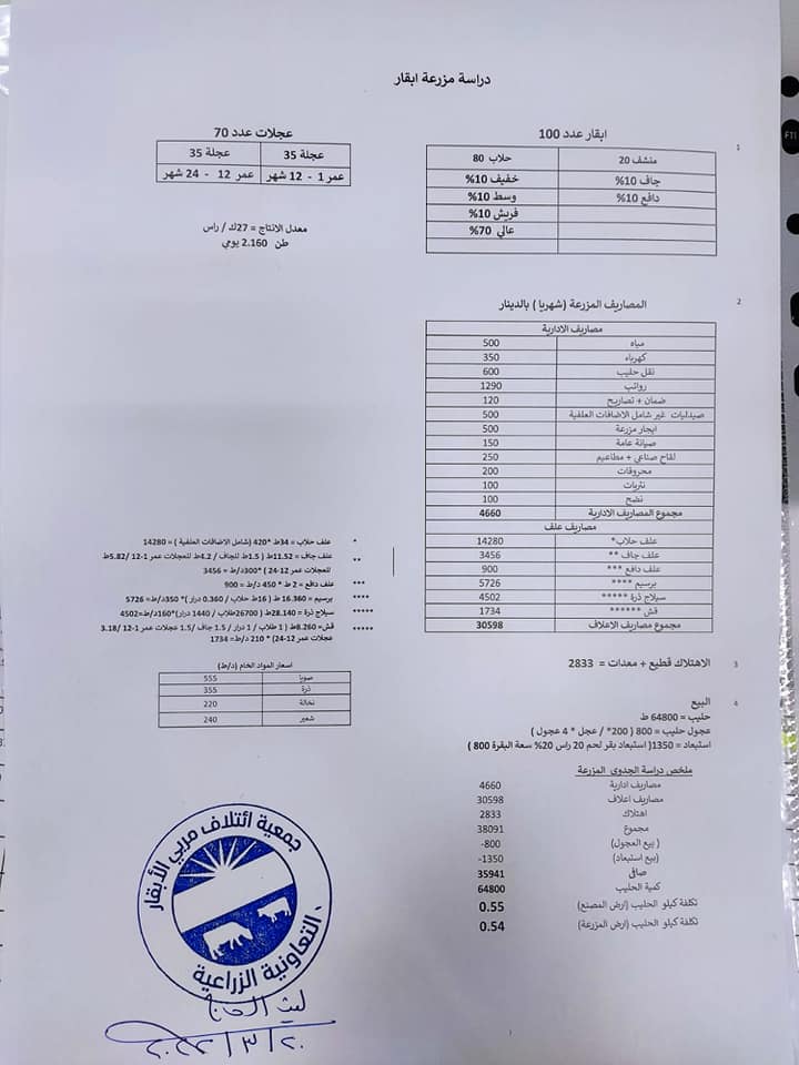 وقال الحاج "وفق دراسة أجريت خلال الأسبوع الماضي فإن تكلفة الكيلو غرام الواحد من الحليب الطازج على مربي الأبقار 55 قرشا واصلا لأرض مصنع الألبان، و54 قرشا على أرض المزرعة، لذا فإننا نعتبر هذا السعر سعرا استرشاديا، وعلى كل مالك مزرعة الاتفاق مع المصانع التي يورّد لها الحليب بشكل ثنائي”.