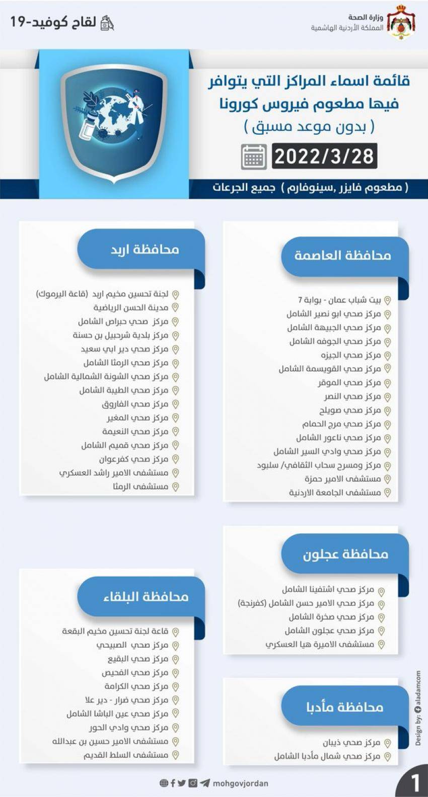 نيروز الإخبارية : أعلنت وزارة الصحة، اليوم الأحد، عن قائمة أسماء المراكز التي يتوافر فيها مطعوم فيروس كورونا بدون موعد مسبق (جميع الجرعات) ليوم الإثنين.