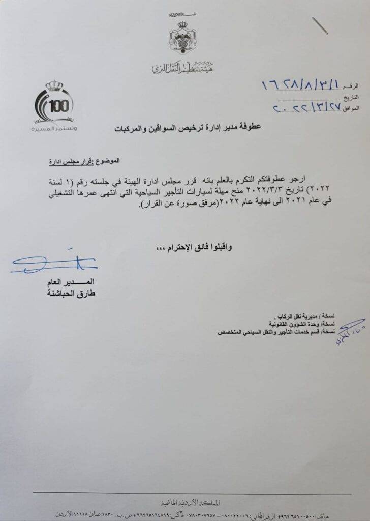 وبحسب وثيقة وصلت صيحفة أخبار الأردن الإلكترونية اليوم الأحد موجهة من الهيئة إلى إدارة ترخيص السواقين والمركبات فلقد تقرر منح مهلة لسيارات التأجير السياحية وذلك بعد مطالبات عديدة من مكاتب تأجير السيارات السياحية.