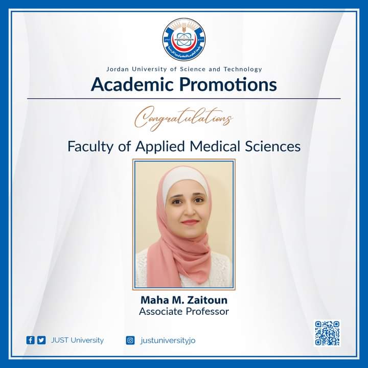• الدكتورة مها زيتون من كلية العلوم الطبية التطبيقية الى رتبة أستاذ مشارك وهي حاصلة على الدكتوراه في السمع من جامعه سدني، استراليا عام 2016، وماجستير في السمع والنطق من جامعة ماك كيروا عام 2012.