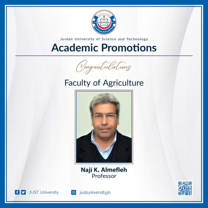 • الدكتور ناجي المفلح من كلية الزراعة "قسم الموارد الطبيعية والبيئة" الى رتبة أستاذ وهو حاصل على الدكـتوراه في الموارد الطبيعية والبيئة من جامعة بول الحكومية عام 2004 وماجستير في ري وصرف من جامعة ولاية داكوتا الجنوبية عام 1998.