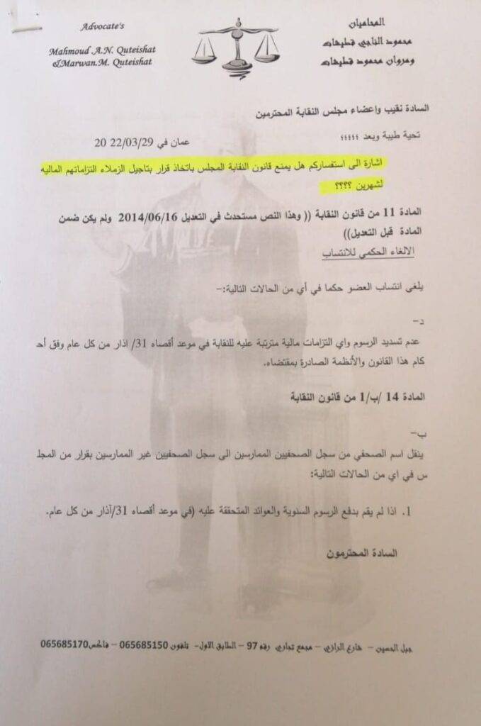 دعا عضو مجلس نقابة الصحفيين الأردنيين خالد القضاة كل "من يستطع تسديد الالتزامات المالية المستحقة عليه لنقابة الصحفيين ليبادر بالتسديد يوم غد الخميس 31 / 3، حتى لا يعرض عضويته في النقابة للشك والعيب القانوني”.