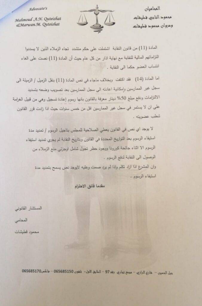 وأوضح القضاة في منشور عبر صفحته على منصة "فيسبوك”، مساء اليوم الأربعاء، أن "الاستشارة القانونية واضحة لا لبس فيها، والعمل بعكسها يعرض كل قرارات المجلس اللاحقة، واجتماع الهيئة العامة المقبل لشبهة عدم شرعيتها القانونية وبالتالي إمكانية الطعن بها”.
