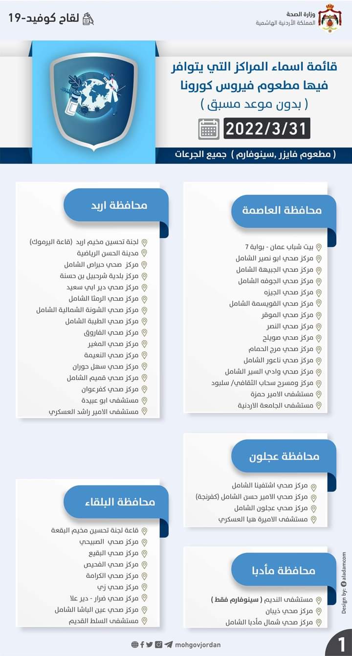 قائمة اسماء المراكز التي يتوافر فيها مطعوم فيروس كورونا (بدون موعد مسبق) #جميع_الجرعات ليوم الخميس الموافق 2022/3/31: