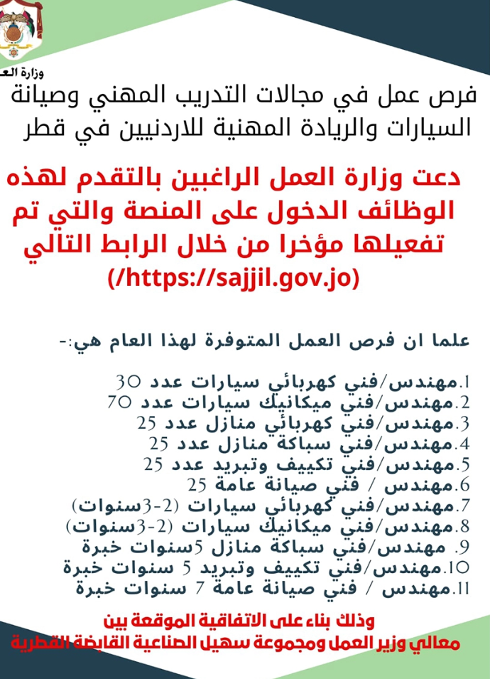 دعت وزارة العمل ، الأردنيين البحاثين عن فرص عمل في دولة قطر من أصحاب التخصصات في الإعلان المرفق الى التقدم عبر منصة العمل القطرية الأردنية التي اعيد تفعيلها.