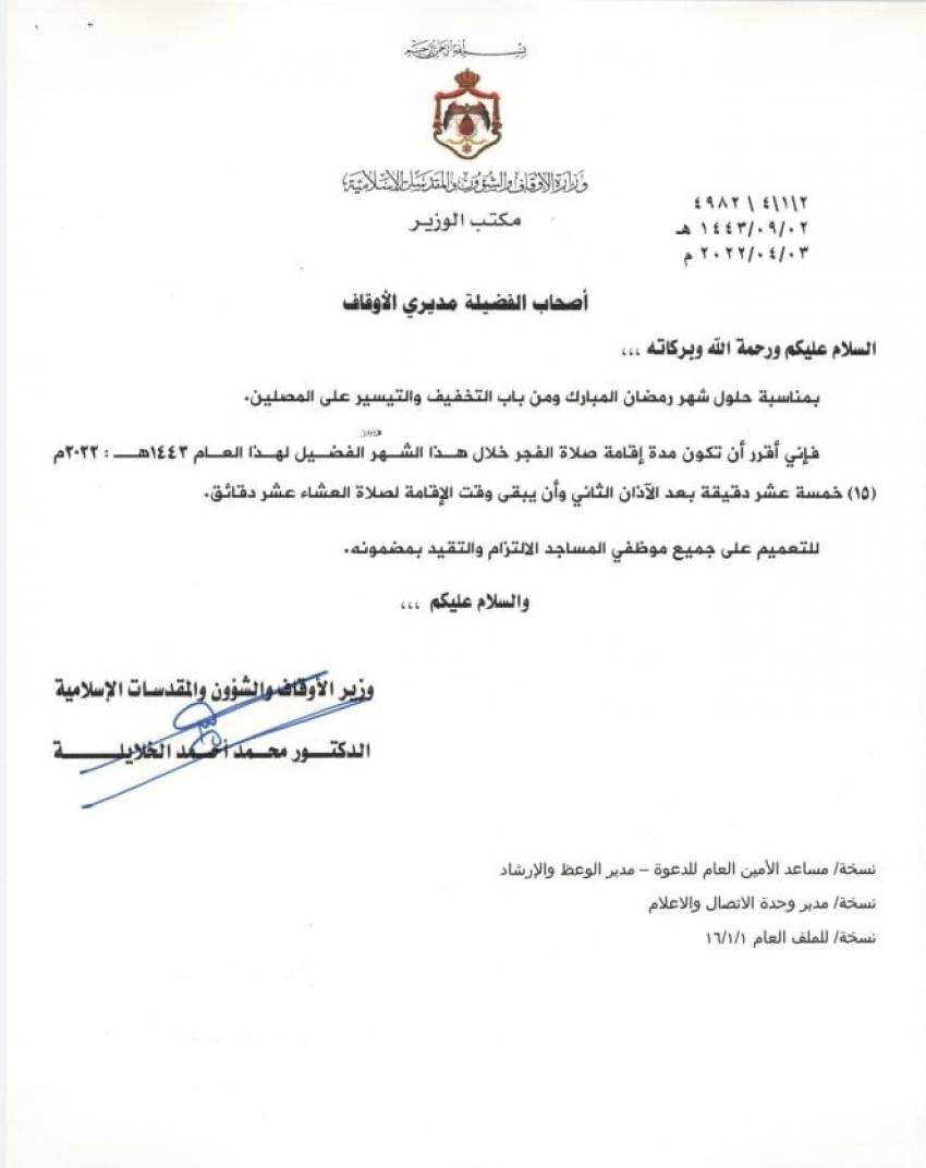 : قرر وزير الأوقاف والشؤون والمقدسات الإسلامية محمد الخلايلة أن تكون مدة إقامة صلاة الفجر خلال شهر رمضان المبارك 15 دقيقة بعد الاذان الثاني.