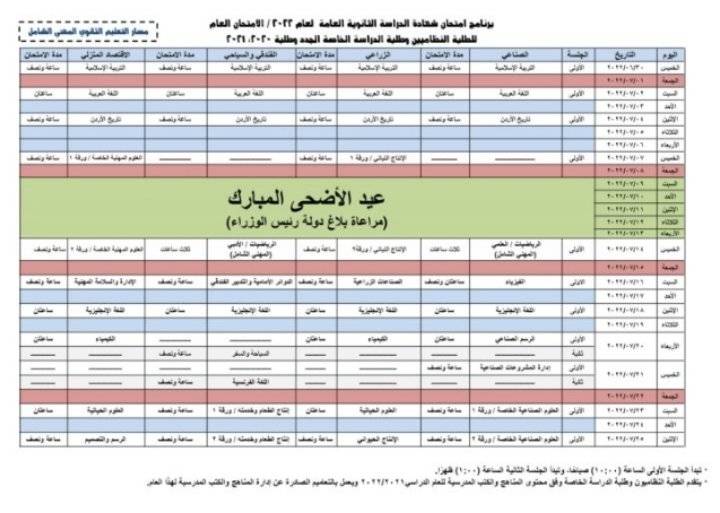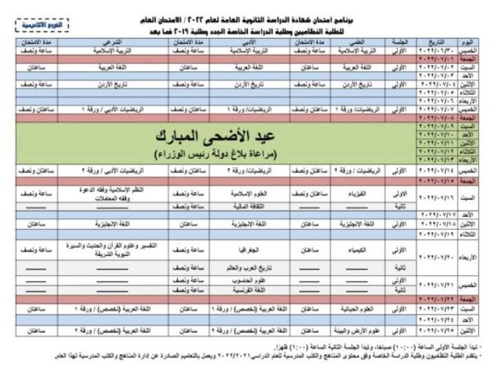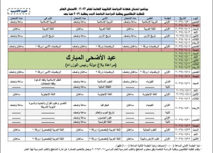 أعلنت وزارة التربية والتعليم اليوم جدول امتحان شهادة الدراسة الثانوية العامة لعام 2022 / الامتحان العام.