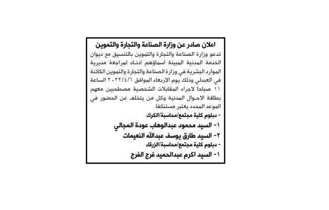 دعت وزارة الصناعة والتجارة والتموين بالتنسيق مع ديوان الخدمة المدنية، مرشحين لإجراء المقابلات الشخصية.