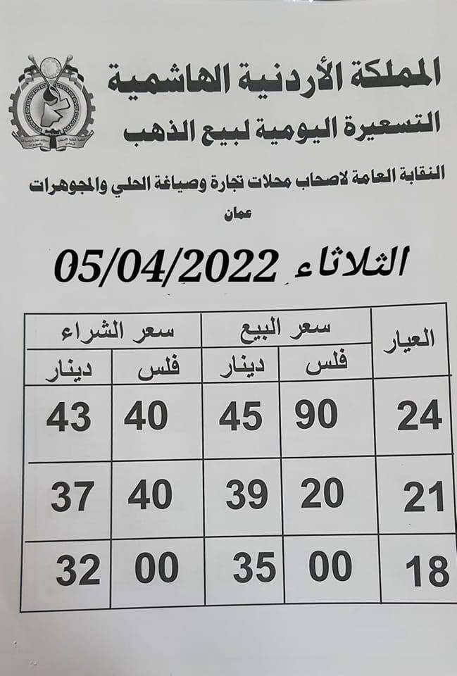 وحسب النقابة العامة لأصحاب محلات تجارة وصياغة الحلي والمجوهرات، فقد بلغ سعر بيع الغرام الواحد من الذهب عياري 24 و18 لغايات الشراء من محلات الصاغة عند 45.90 دينارا، و35.00 ديناراً على التوالي.